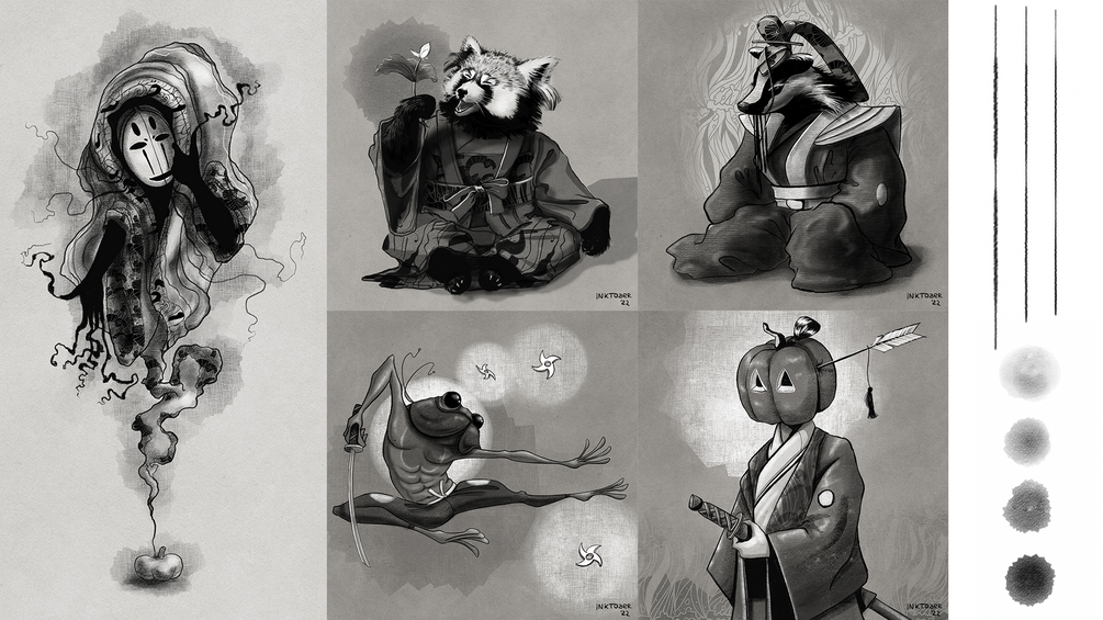 To learn more about these brushes, how I created them, how to configure them, how to apply a gold effect, and how to create your own brushes visit my website at: https://www.juliaviers.art/illustrations/no-face-ukiyo-e